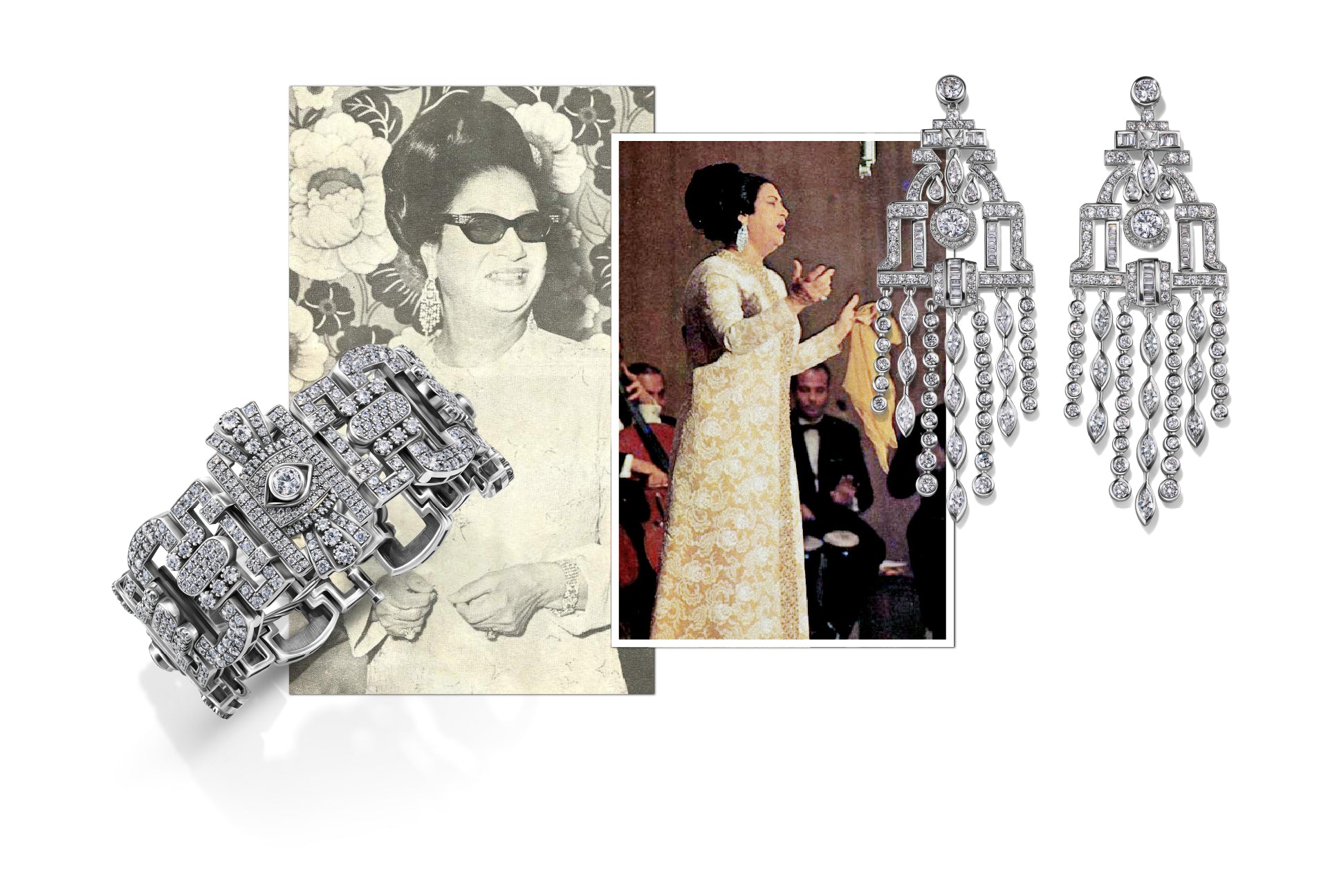 For years, Azza Fahmy has been fascinated with the life and work of Umm Kulthum, a fascination that was translated into two collections dedicated to the legend. It was a true full circle moment when 2 years ago director Marwan Hamed approached Azza Fahmy and Amina Ghali to design and curate the jewellery for ‘El Sett’, the biopic detailing the life of the Egyptian icon. It was a deeply rewarding, yet challenging, journey: we researched, dug through archives, and revisited the star’s and the era’s most significant moments. The result is reimagined jewellery that honours her and belongs to her era.