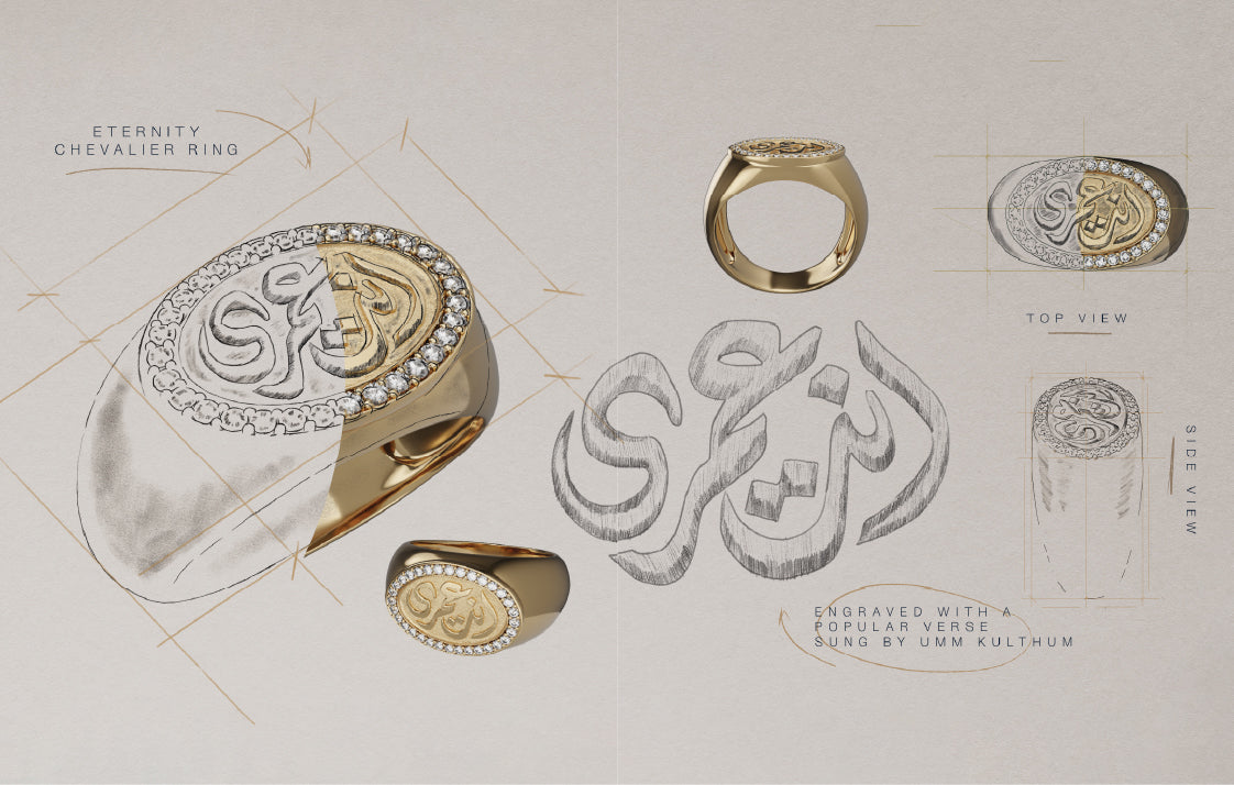SUMA, launched in 2014, was the first dedicated tribute. Lyrics we know by heart became part of our design language: calligraphies and silhouettes that carry the weight of love. From there, her songs began to live within our pieces. What started as a salute grew into signatures of our craft, a pillar of who we are.