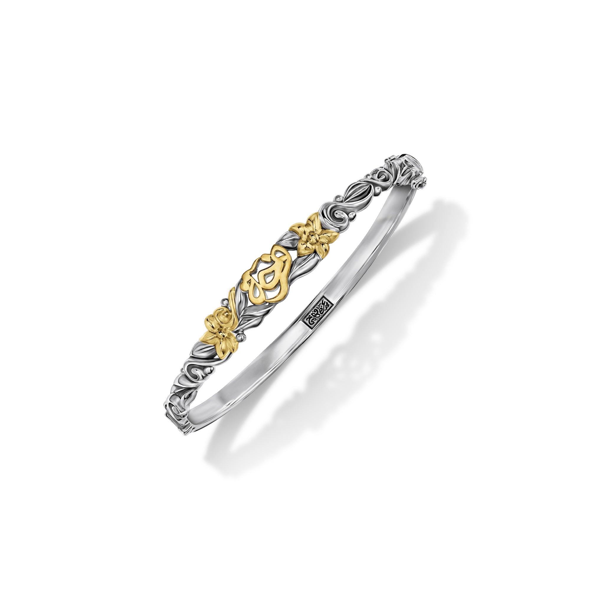 An uplifting statement of ‘joy – فرحة’ in 18kt Gold calligraphy intertwined with whimsical hand pierced Sterling Silver star jasmines and undulating leaves in a design that encapsulates hope and celebration.